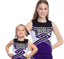 All of our custom cheer apparel is made in youth and adult sizes. Our custom lettering is proportionally sized down for youth sizes for an awesome look on those smaller shells.